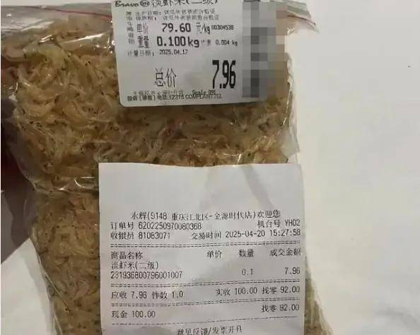 据媒体报道,近日,有消费者在重庆一家永辉超市购物,购买了标价为7.96元的淡虾米,他拿出100元支付,结果超市只给他找回了92元,也就是少了四毛钱。