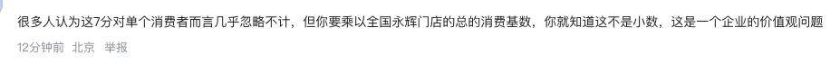 还有网友则认为,「很多人认为这7分对单个消费者而言几乎忽略不计,但你要乘以全国永辉门店的总的消费基数,你就知道这不是小数,这是一个企业的价值观问题」