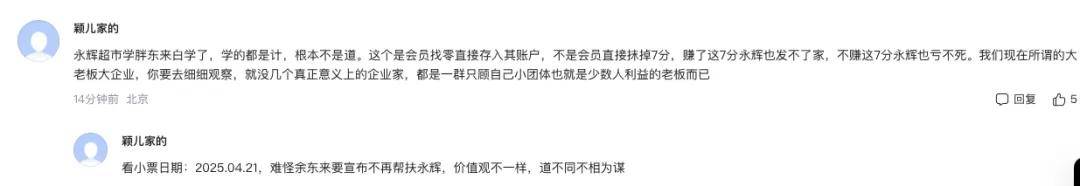 也有网友则表示:难怪于东来要宣布不再帮扶永辉,价值观不一样,道不同不相为谋。