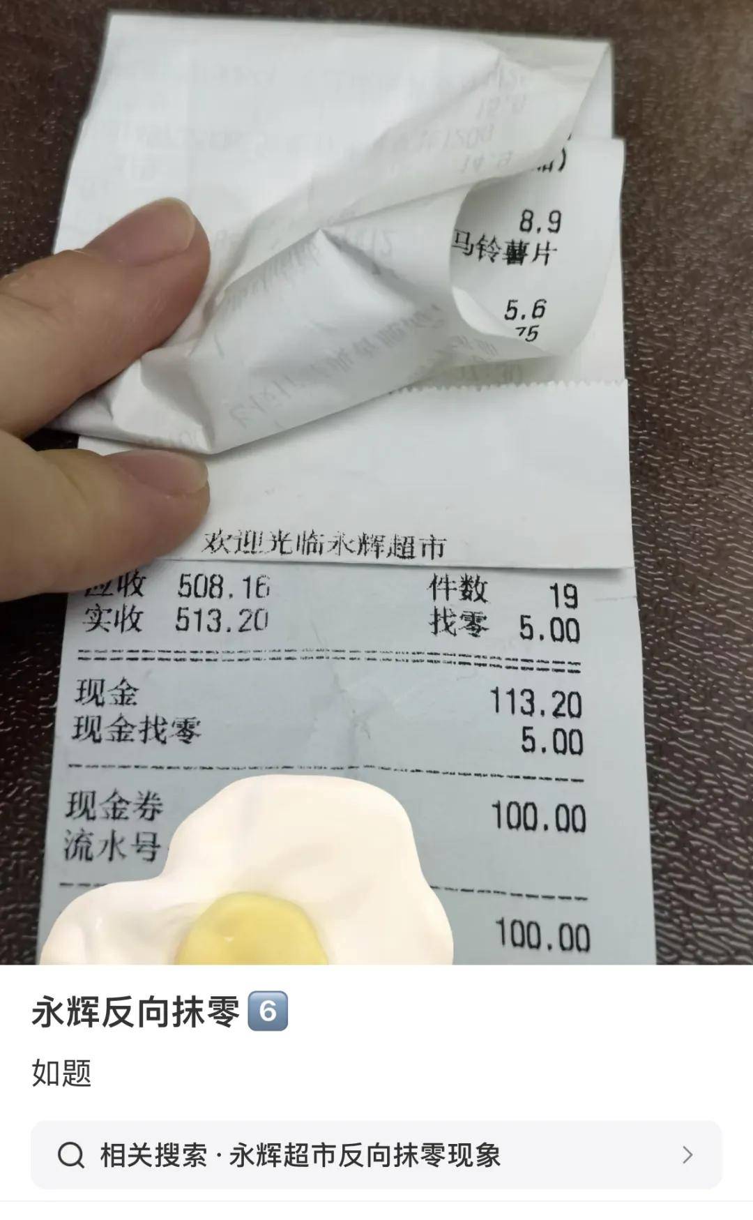 比如仅在小某书上,关于永辉超市反向抹零的笔记就有三百多条。