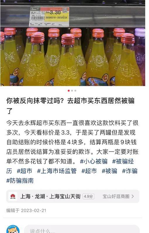 用消费者表示:你被反向抹零过吗?去永辉超市买东西被骗了。「标价3.3元,于是买了两件,结账的时候价格4块多,两瓶则成了9块钱」