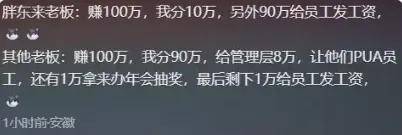 正如有网友总结,胖东来老板:赚100万,我分10万,另外90万给员工发工资;其他老板:赚100万,我分90万,给管理层分8万,让他们PUA员工,还有1万拿来办年会抽奖,剩下的1万给员工发工资……