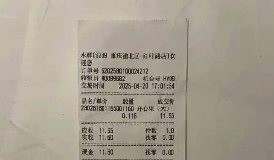 比如红叶路店标价11.55元的开心果,实收了11.6元;观音桥店标价3.45元的黑芝麻丸,实收了3.5元;龙头寺店标价0.66元的玉米珍,实收了0.7元;较场口店标价4.97元的绿豆糕,实收了5元……