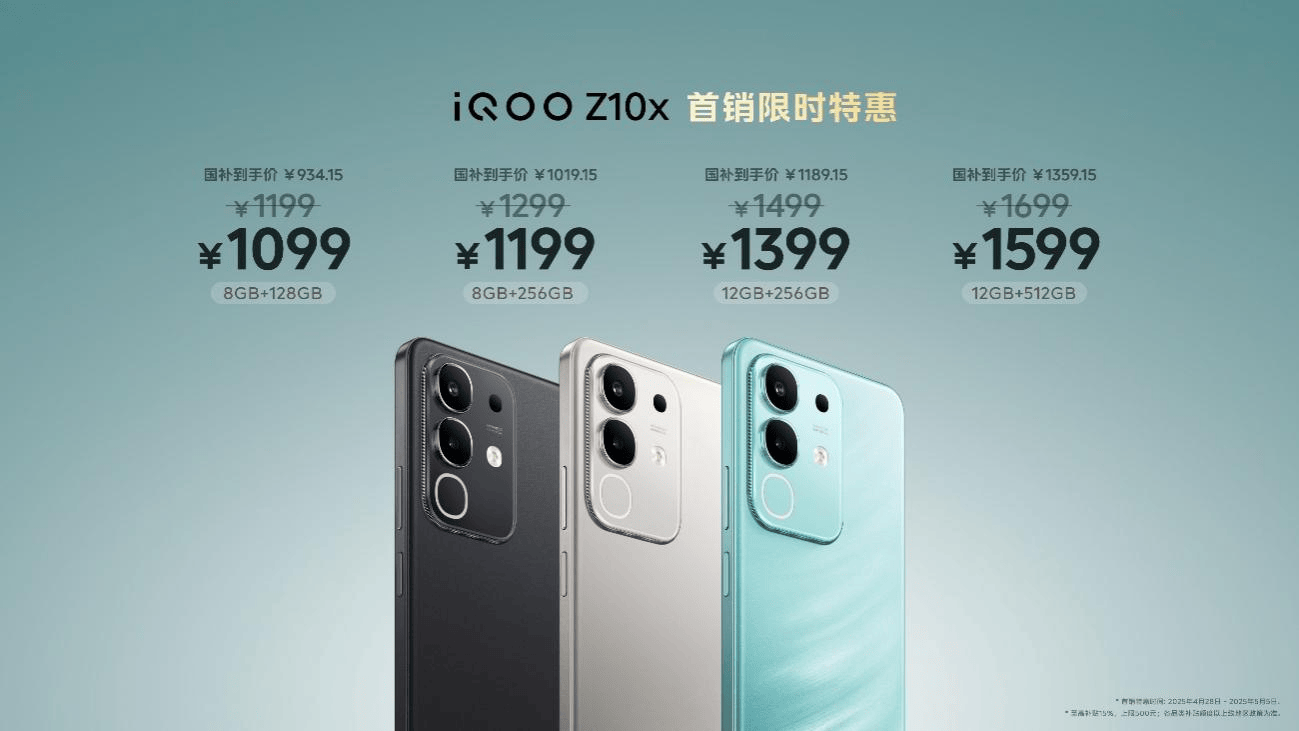 iQOO Z10 Turbo 系列共有“燃”、“沙漠色”、“云海白”和“星穹黑”四种配色可选,两款产品都提供12GB+256GB、12GB+512GB、16GB+256GB和16GB+512GB四种存储组合可选,iQOO Z10 Turbo Pro 到手价1999元起,国补到手价1699.15元起、iQOO Z10 Turbo 到手价1799元起,国补到手价1529.15元起。iQOO Z10x 共有“风羽青”、“月岩钛”和“星穹黑”三种配色可选,提供8GB+128GB、8GB+256GB、12GB+256GB和12GB+512GB四种存储组合可选,到手价1199元起,首销限时特惠全版本减100元,到手价1099元起,国补到手价934.15元起。