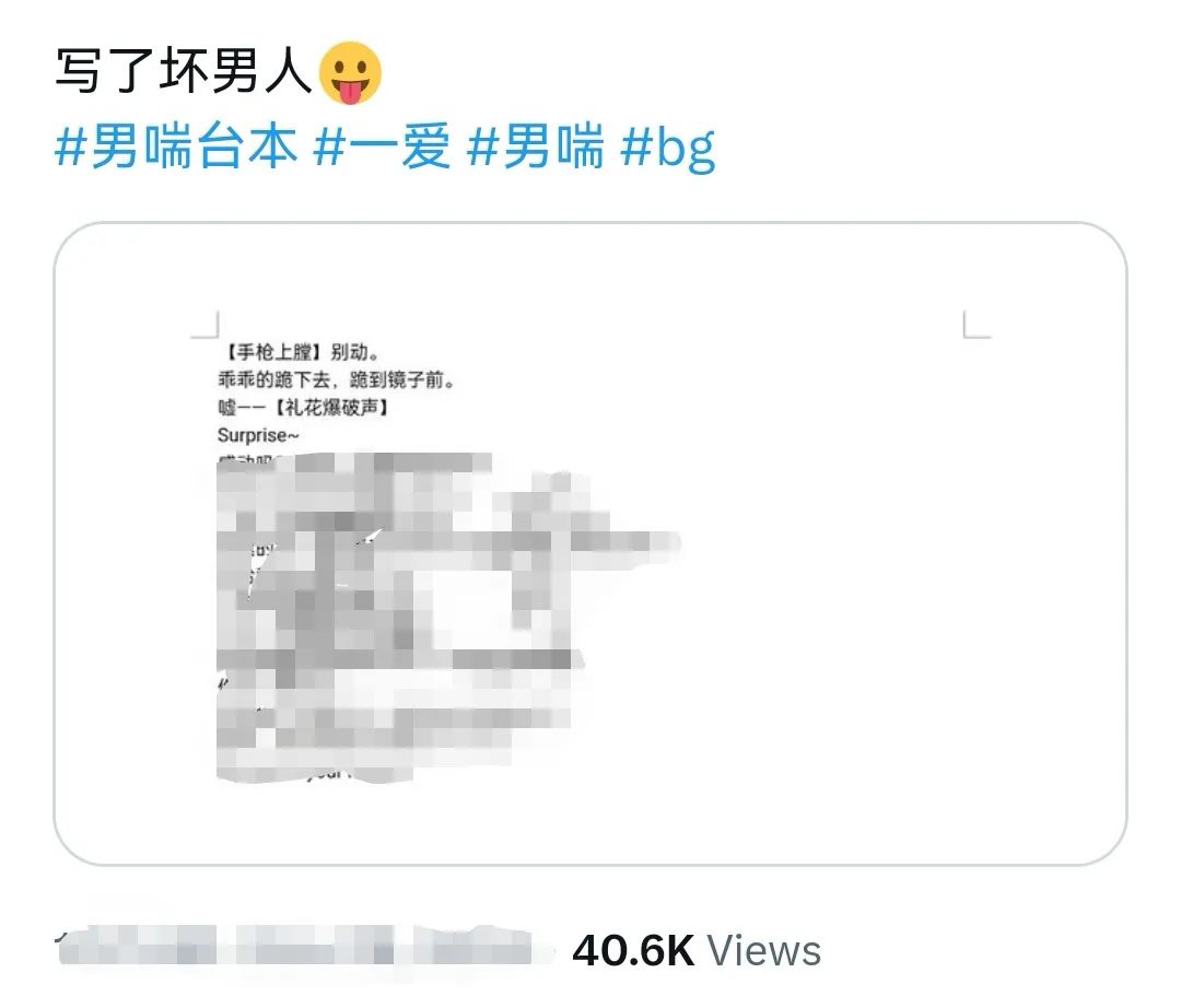 他指出,包括台本娘(提供男喘剧本)、定制音频的私信沟通也是通过X比较多,“有些主播会公开自己的微博、B站、微信号,虽然也可以接本子和定制,但不如在Twitter上接单安全,还能收到外国人派单和付费”。同时,小A也提到,为了能够多渠道打开市场,“一些主播会把剪掉敏感内容的‘清水版’音频发在国内平台,要想听R18版本就需要留言或者私信主播购买”。