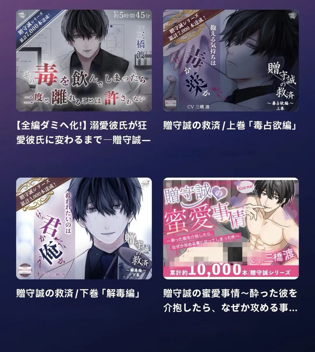 而基于海外收听、消费的合法性,也诞生了不少在女性向成人音频市场极受欢迎的知名男喘,比如antique、八神仙等。甚至,像二回战中的“床下有人”系列或是三桥渡的“赠守诚”系列的男喘作品,更是因优质的“喘”成为备受推崇的必听之作,迄今仍是DLsite的畅销经典。