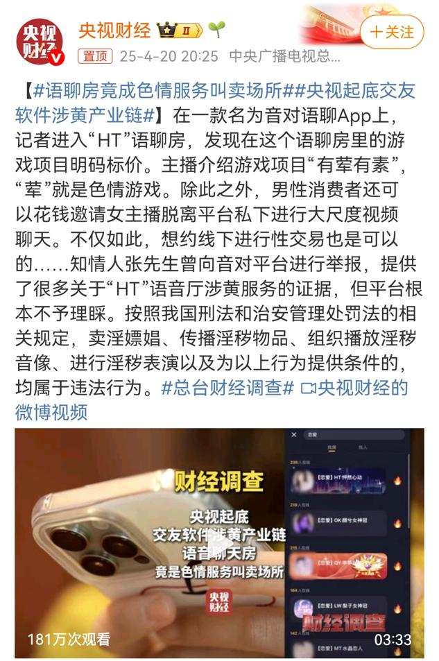 据央视财经近期报道,语聊App“音对”被吧曝出通过语聊房来提供明码标价的游戏项目和私聊服务,为男性消费者提供大尺度聊天、线下色情交易等,该平台也被知情人举报至相关部门。