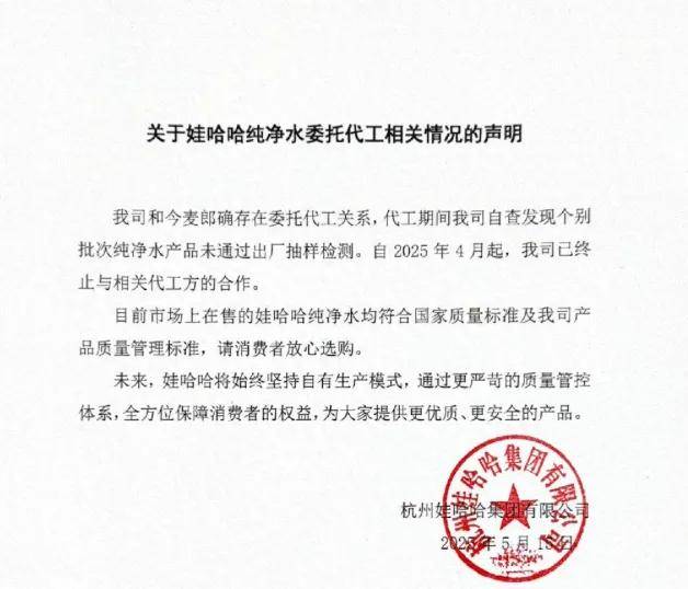 甚至在声明最后一段:「未来,娃哈哈将始终坚持自有生产模式,通过严苛的质量管控体系,全方位保障消费者的权益,为大家提供更优质、更安全的产品……」