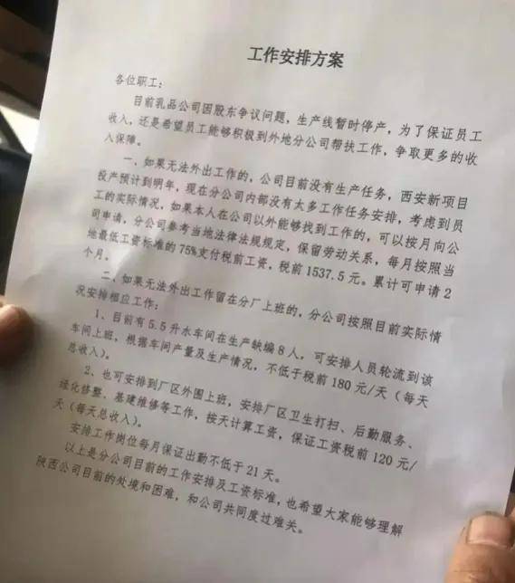 而员工们不得不求助于当地劳动部门,在相关单位协调下,公司负责人终于给出了解决方案,,表示目前乳品公司因股东争议问题,生产线暂时停产,希望员工能够积极到外地分公司帮扶工作,争取更多的收入保障。