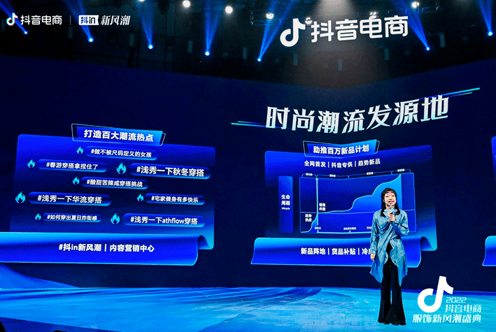 2022年9月20日,抖音电商服饰新风潮盛典在杭州举行。和以往不同的是,抖音电商服饰行业的这次盛典,除了讨论重点议题的峰会,还举办了一场秋冬上新趋势大秀。“无性别风潮”、“运动闲适潮”、“优雅极简潮”、“顶流华风潮”、“复古未来潮”五大秋冬流行趋势,通过超30家知名品牌和新锐设计师品牌的近百套total look展现出来,呈现了一场与近期国内外时装大秀的同一水准的大秀。所有秀款都是秋冬上新趋势款,在现场直播中大部分都可即秀即买。