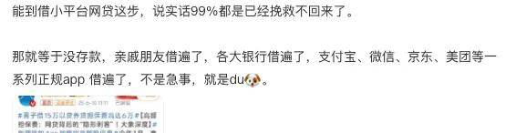 「能到借小平台网贷这步,说实话99%都是已经挽救不回来了。那就等于没存款,亲戚朋友借遍了,各大银行借遍了,支付宝、微信、京东、美团等一系列正规app 借遍了,不是急事,就是du」