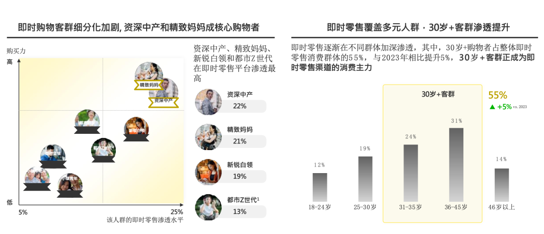 凯度咨询最新调研覆盖全国337个城市的2000名消费者,揭示出30岁以上群体首次以55%的占比成为即时零售主力军,较2023年提升5%。