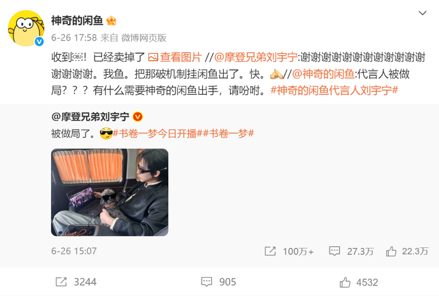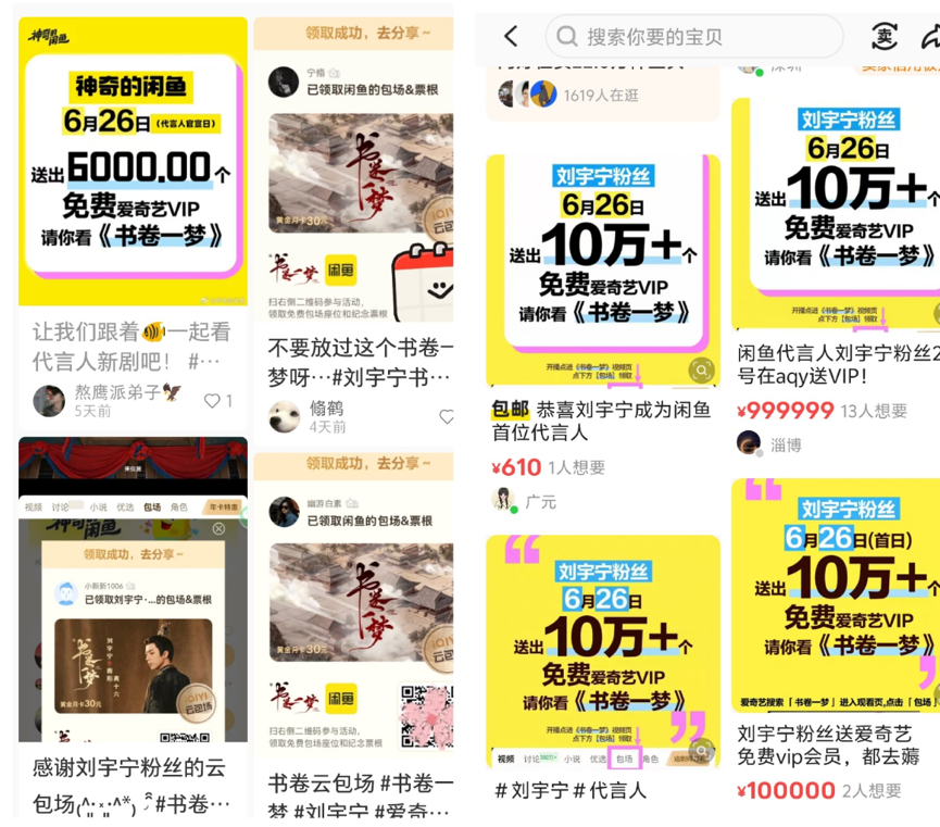 除了平台资源的全面支持外,闲鱼选在剧集开播当天官宣代言人玩精准卡点,剧粉们也立刻进入“快乐打工”状态。粉丝还在闲鱼里送VIP、挂反派“书卷一梦反派10元包邮”、官方又“请各位灵魂画手把南珩爆改成国漫男主”……小红书、微博、短视频再到闲鱼主场,全被《书卷一梦》的二创内容承包了——通过品牌与粉丝的双向奔赴,闲鱼想传递的产品功能和品牌调性,跟着这股热闹劲自然而然就破圈了。
