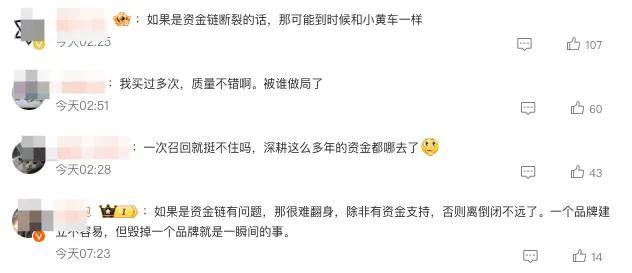 也有消费者质疑,「一次召回就挺不住吗,深耕这么多年的资金都哪去了」还有消费者表示:「如果是资金链有问题,那很难翻身,除非有资金支持,否则离倒闭不远了。一个品牌建立不容易,但毁掉一个品牌就是一瞬间的事。」