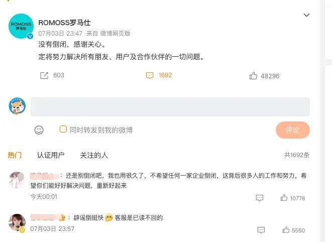 在该微博的评论区,有人表示,不希望罗马仕倒闭,不希望任何一家企业倒闭,这背后有很多人在工作和努力,希望罗马仕能好起来!