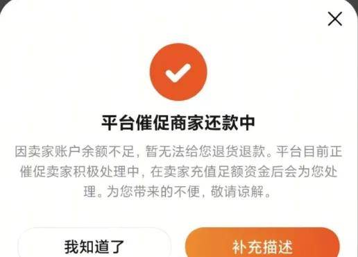 而事实上,在淘宝店余额不足之外,根据此前媒体报道,就算消费者提交无害化处理(如盐水浸泡)证明后,官方依然提示,因公司账户资金不足,平台退款延迟30-90天。