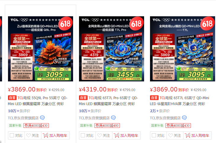 除了85T7LPro,还有75T7K、65T7L等多款产品,像65T7L在补贴过后最低价可达3000左右,足可见TCL正在将万元级高端显示技术下放至主流价格带。