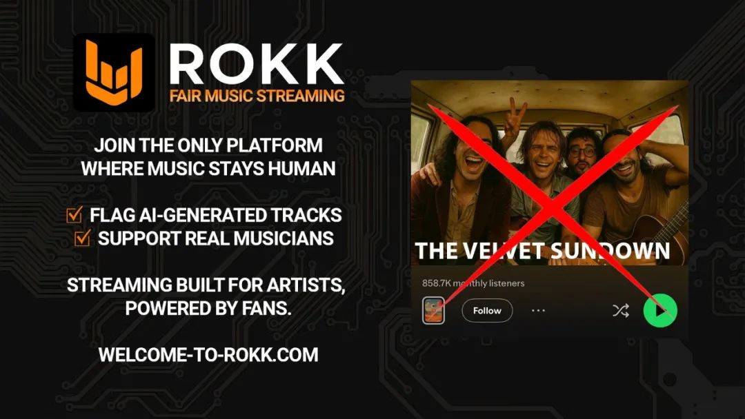 今年7月,摇滚流媒体平台ROKK针对AI音乐人The Velvet Sundown在Spotify爆红一事,公开表达立场。ROKK在公告中发布了该乐队的Spotify页面截图,并打上醒目的“X”标记,明确表示禁播完全由AI生成的音乐。