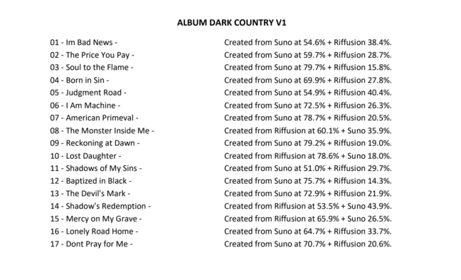 Aventhis第二热门的歌曲《I’m A Dead Man Walkin’》(播放量超40万)中,Suno的生成占比高达86.7%。不仅如此,Aventhis在过去四个月内发布的三张专辑、共57首歌曲,无一例外,皆主要由Suno和Riffusion生成。
