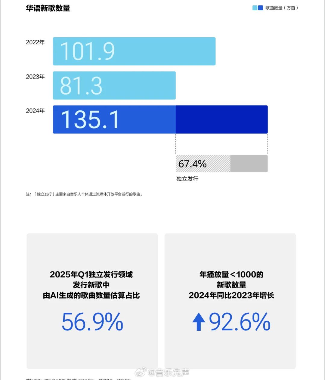 在国内,版权与责任的真空问题也日渐显现。根据《华语数字音乐白皮书》显示,据估算,2025年第一季度,AI生成的音乐在国内独立发行领域占据了高达56.9%的比例。