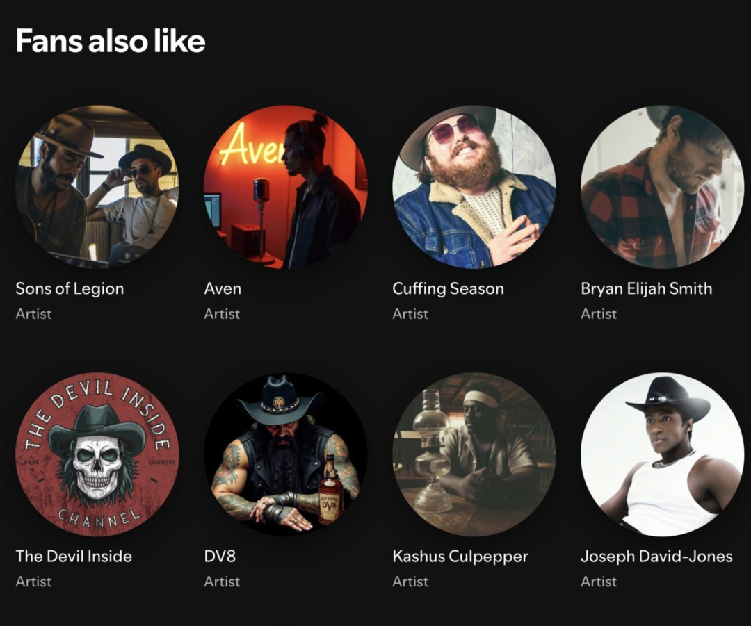 此外, 据统计,Spotify的“粉丝也喜欢”的推荐栏中,目前至少还有13位活跃AI音乐人,总计月度听众超过410万人。相对比一年前我们报道的的“幽灵艺术家”如The Highway Outlaws、Waterfront Wranglers、Saltwater Saddle等,现在的AI音乐人已经迭代,商业化路径也更清晰完整。