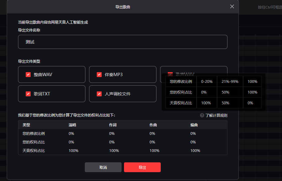 值得注意的是,各平台在AI 生成作品的权利归属机制上也有所不同。以“天音”为例,其版权分配规则取决于用户对生成内容的修改比例:若用户修改占比在 0%–20%之间,作品的相关权利将全部归平台所有。换言之,创作者若未对生成内容进行实质性加工,将无法获得任何版权。