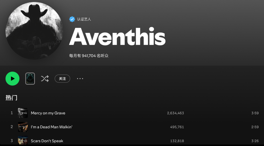 最具代表性的案例,是近期在Spotify迅速蹿红的“乡村歌手”Aventhis。短短三个月内,这位AI音乐人发布了3张专辑、多达57首歌曲,月度听众一度飙升至107万(目前为99.1万)。代表作《Mercy On My Grave》不仅在Spotify上收获超200万播放,YouTube播放量也突破161万,其YouTube账号还有超过3.37万人订阅。