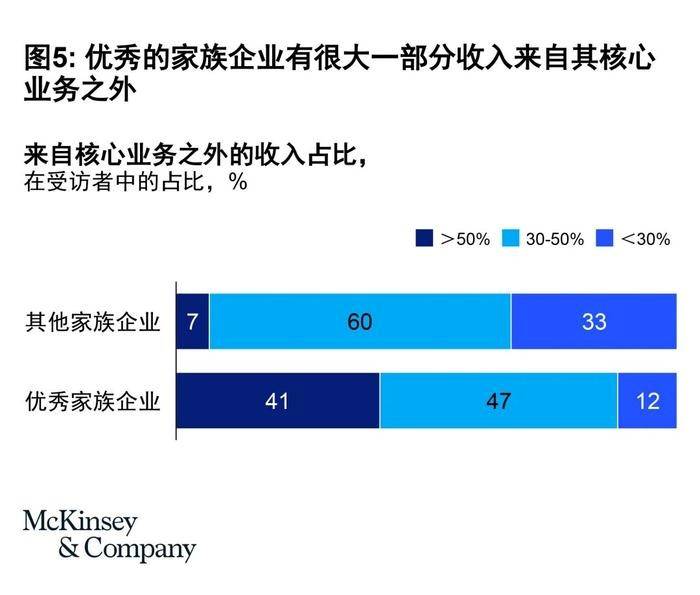 家办是全球投资领域的重要参与者,占初创企业投资的31%、房地产投资的15%以及基金投资的14%。不难看出,其实优秀的家族企业的业务组合都十分多元,数据显示,40%的优秀家族企业有一半以上的收入来自核心业务之外,其他家族企业只有7%。