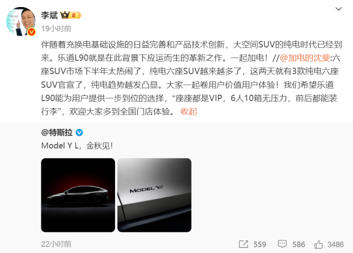 对于Model Y L官宣,上周刚发布乐道L90的乐道掌门人沈斐也在第一时间发声,“六座SUV市场下半年太热闹了,纯电六座SUV越来越多了,这两天就有3款纯电六座SUV官宣了,纯电趋势越发凸显。大家一起卷用户价值用户体验!我们希望乐道L90能为用户提供一步到位的选择,‘座座都是VIP,6人10箱无压力,前后都能装行李’,欢迎大家多到全国门店体验。”