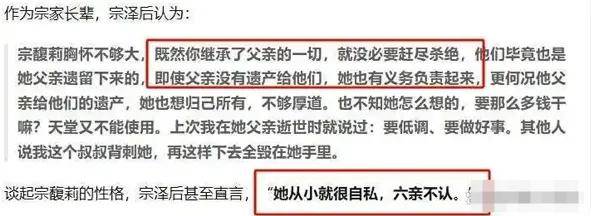 就连宗泽后这个曾经不怎么出现在公众视野中的弟弟,竟然意外地成了该起财产之争中的一线爆料者,又是晒小道消息,又是晒族谱,又是吐槽自己的侄女宗馥莉六亲不认、太自私。