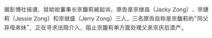 然而,天算究竟是输给了人算,万万没想到,在宗庆后去世一年五个月后,宗氏家族竟然内讧了,突然冒出三个亲生孩子,开始与宗庆后所谓的独女宗馥莉,争起了340亿元巨额的遗产。